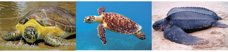 Nota. Imagen izquierda, rescatada de: https://ecosistemasdecostarica.blogspot.com/2012/03/parque-nacional-tortuguero.html; imagen central, rescatada de: https://www.naturalista.mx/guide_taxa/706882; imagen derecha, rescatada de: https://www.tortugaswiki.com/imagenes-fotos-de-tortugas-baulas-jpg