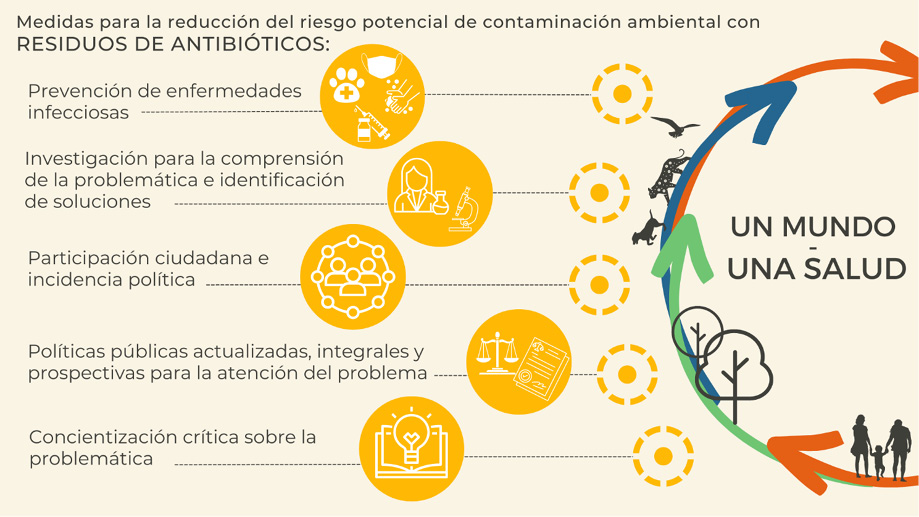 La problemática causada por la contaminación ambiental con residuos de antibióticos y propagación de bacterias resistentes debe ser abordada desde una visión holística con estrategias integrales y transdisciplinarias (Regea, 2018). Por lo tanto, para el establecimiento y aplicación de medidas preventivas y de control, es necesario generar alianzas multisectoriales en el ámbito local, nacional y mundial.