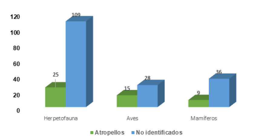 Conforme se describe en el cuadro 3, el grupo de los mamíferos fue el de menor afectación comparado con otros grupos taxonómicos. La condición podría deberse a que estas especies son más sensibles a los ruidos y las luces emitidas por los vehículos, por tanto, los individuos no se acercan con tanta frecuencia a la ruta nacional.