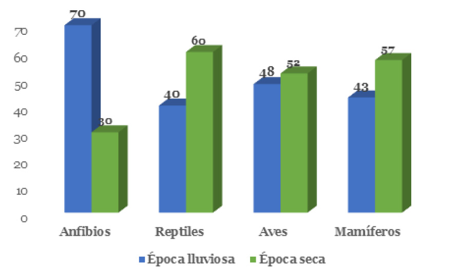 Por otra parte, la afectación a la fauna silvestre, según la época del año, varía dependiendo del grupo. No obstante, la investigación indica que los anfibios suelen tener más afectación en la época lluviosa. Con respecto a las aves y mamíferos no se presentó una tendencia clara ya que los datos son similares a lo largo del año (figura 3).