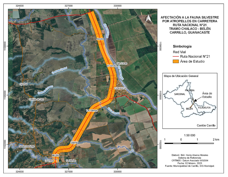 La caracterización de la fauna silvestre atropellada se realizó en el cantón de Carrillo, provincia de Guanacaste, en un sector de 10 km de longitud que van desde el sector conocido como “cruce de Chalaco” (coordenadas CRTM-O5: X 328342,1, Y: 1160081.1 en el distrito de Filadelfia), hasta el parque del distrito de Belén (coordenadas CRTM-O5: X: 326180.1, Y: 1151310.8), sobre la Carretera Nacional n.o 21, (figura 1).