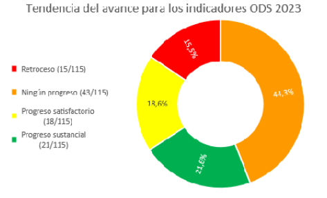 La tendencia se refiere al comportamiento observado del indicador desde el 2015 hasta el 2023. Con respecto al avance de los indicadores para el año 2022, se tiene un progreso de cuatro indicadores al 2023 que muestran progreso sustancial o la meta casi alcanzada (color verde). De la misma forma, se presenta un aumento en indicadores que no muestran ningún progreso (color naranja), pasando de 41 a 43 indicadores, también para los que muestran retroceso (color rojo) pasando de 6 a 15 indicadores (ver figura 2).