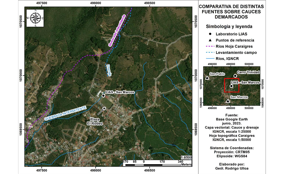 Comparación de cauces según cartografía y capas vectoriales del IGNCR y levantamiento de campo realizado