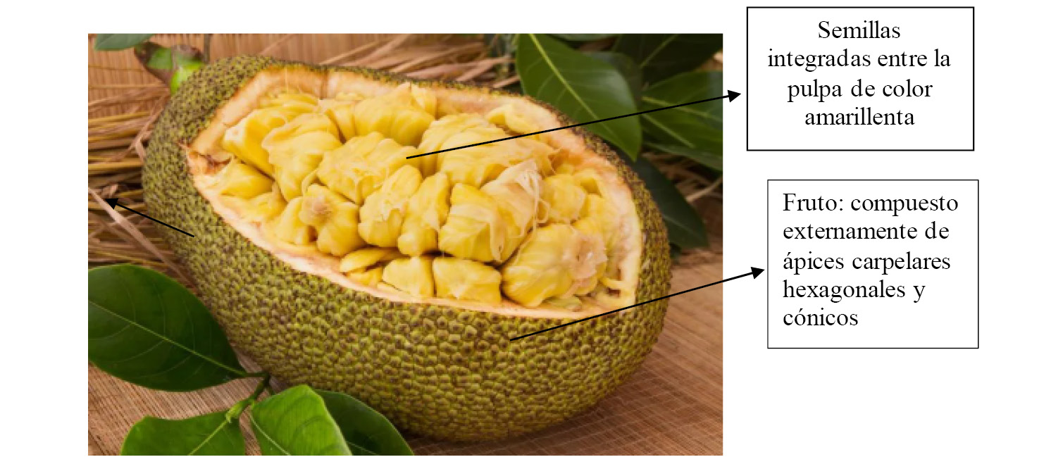 El fruto (ver figura 4) es un sincarpo -tipo de fruto resultante de la fusión de varios frutos provenientes de una sola flor-, oblongo globoso, colgado en el tronco, masivo, 25-100 cm de largo, 20-25 cm de diámetro, carnoso, marrón externamente, con una pulpa que va del color rojo al anaranjado, así como del amarillo al blanco. El fruto puede pesar desde los 30 kg hasta los 50 kg. El fruto se compone de tres regiones principales, las cuales son (1) el eje del fruto; (2) el perianto persistente; (3) el verdadero fruto. Debido a la presencia de células laticíferas que producen látex, que ayuda a mantener unidos los frutos, el eje y el corazón del fruto no son comestibles (Esquivel et al., 2013, párr.9; Rasn Ranasinghe et al., 2019, párrafos 8, 10, 11, 12).