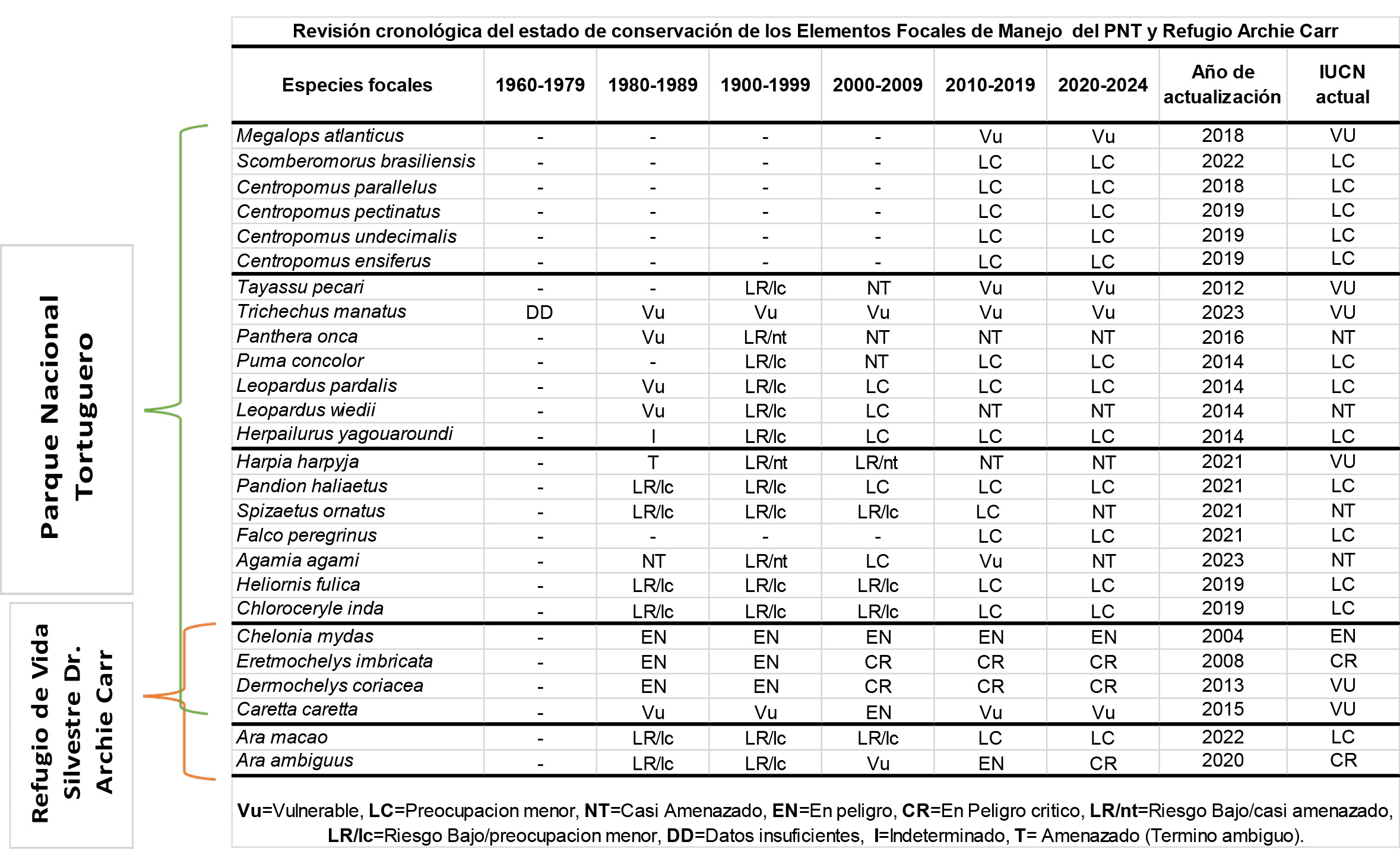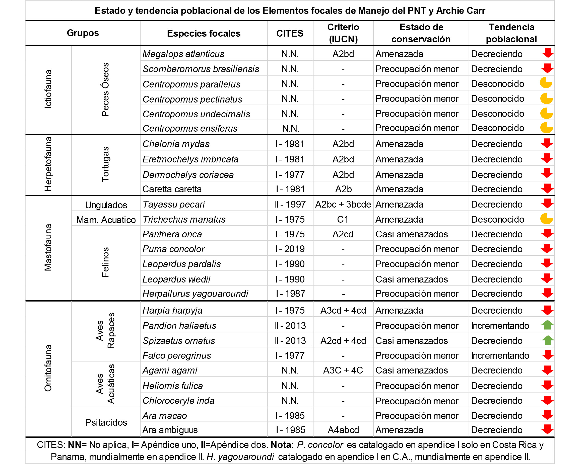 A continuación, se puede apreciar en la tabla 2 el estado y tendencia poblacional de los elementos focales de manejo del Parque Nacional Tortuguero y del Refugio de vida silvestre Arch Carr.