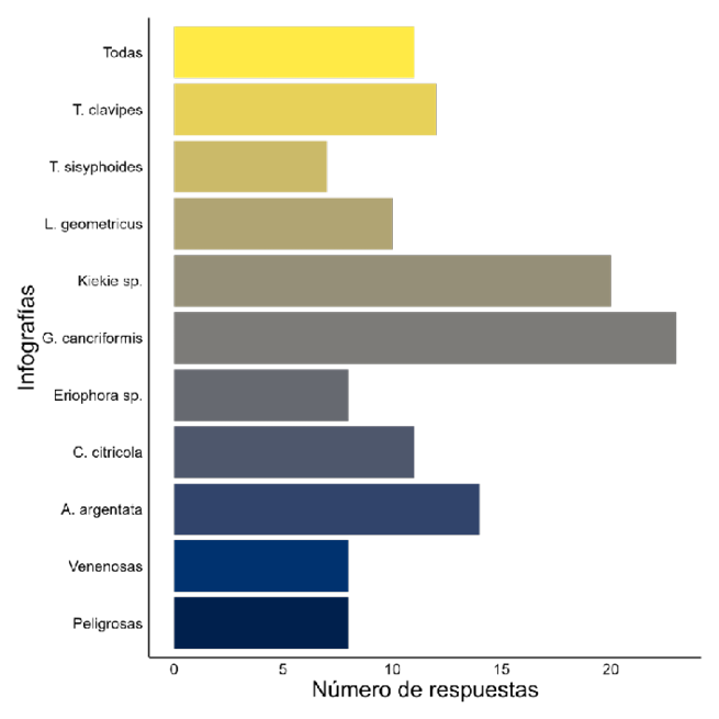 El cuestionario en línea recibió 37 respuestas en total. Sin embargo, el número de respuestas recibidas varió entre las infografías (figura 4). El menor número (siete observaciones) correspondió a la infografía que mostraba a la araña Tidarren sisyphoides y el mayor número (23 observaciones) a la infografía que mostraba la araña Gasteracantha cancriformis, la araña panadera. Así, 30% de los participantes (11 personas) observaron todas las infografías. De las 37 personas que enviaron el cuestionario, todas excepto una, señalaron que la información fue presentada de una manera clara y agradable.