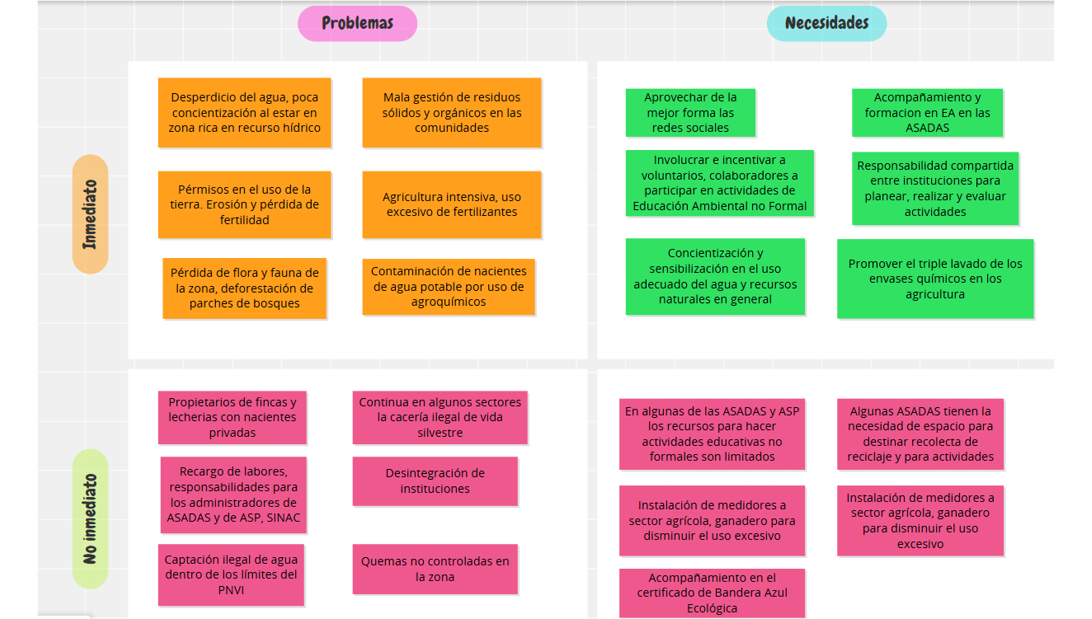 Desde el rol de facilitadora durante el proceso de investigación con las organizaciones involucradas, se identifican en ambas partes las necesidades socioambientales para proveerles del material educativo no formal necesario para comprender la necesidad de incentivar la protección del agua y promover la participación en este objetivo de las comunidades incluidas en el programa.