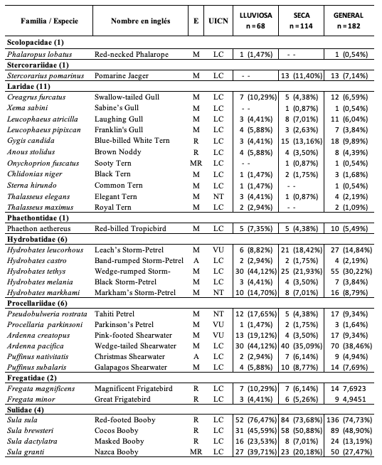 La riqueza específica de aves marinas registrada para el estudio se compone de 31 especies detectadas, pertenecientes a ocho familias, según la taxonomía de la American Ornithological Society (Chesser et al., 2025). Las familias con más representantes son Laridae (11 spp.), Hydrobatidae (6 spp.) y Procellariidae (6 spp.). Según las observaciones por periodo de 1-hora Sula sula (74,73 %), Sula brewsteri (48,90 %), Ardenna pacifica (38,46 %), Hydrobates tethys (30,22 %) y Sula granti (27,47 %) fueron las especies con mayor detección durante los muestreos. Cuatro de las especies fueron reportadas solo una vez Phalaropus lobatus, Xema sabini, Onychoprion fuscatus y Sterna hirundo (cuadro 2, figura 3).