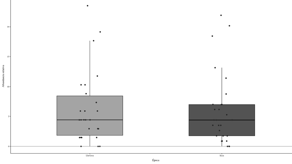 Aunque los resultados no evidenciaron diferencias estadísticas significativas en la abundancia por época, sí mostraron una tendencia superior en época seca, lo que aporta diferencias taxonómicas y ecológicas, así como variabilidad intra e intergrupal en la abundancia media de las especies.