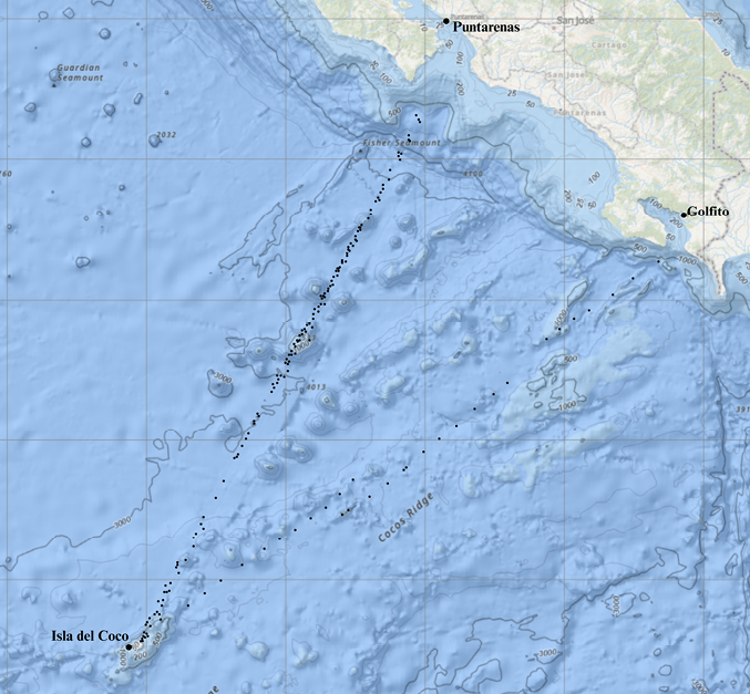 Cambra, M., Lara-Lizardi, F., Peñaherrera-Palma, C., Hearn, A., Ketchum, J. T., Zarate, P., et al. (2021). A first assessment of the distribution and abundance of large pelagic species at Cocos Ridge seamounts (Eastern Tropical Pacific) using drifting pelagic baited remote cameras. PLoS One, 16(11), e0244343. https://doi.org/10.1371/journal. pone.0244343