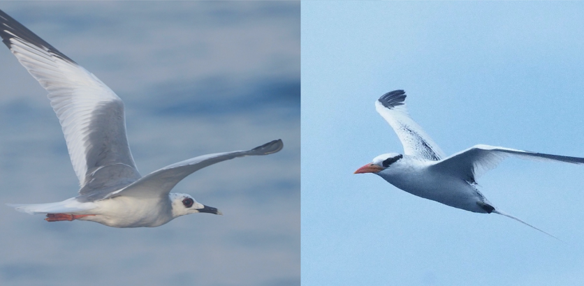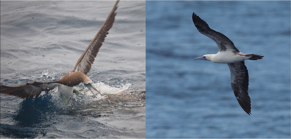 Phaethon aethereus (derecha), aunque registrada en menor número de individuos, fue observada en la mayoría de las expediciones.