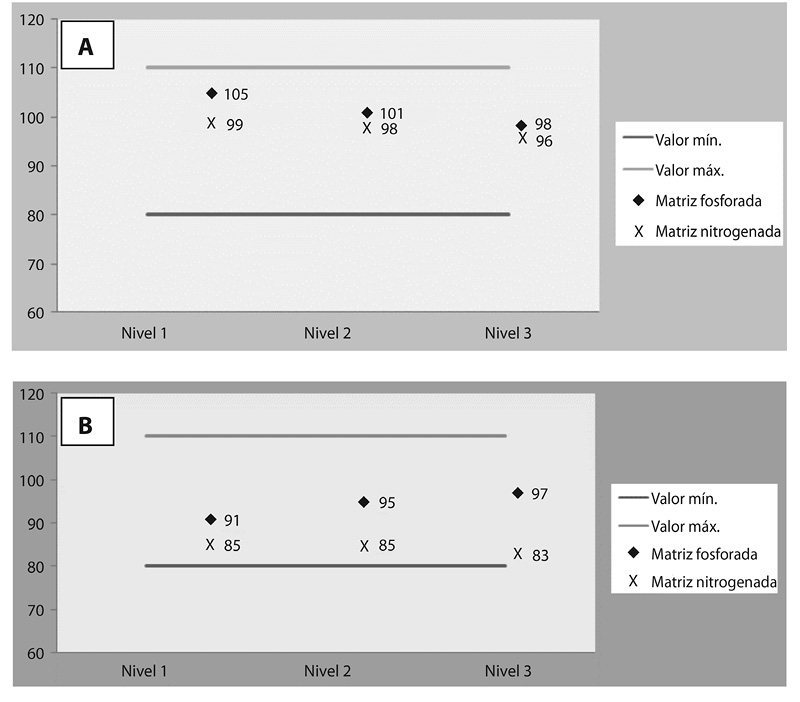 Elementos analizados en llama: como se observa en los Cuadros 4 y 5, tanto en la matriz fosforada como nitrogenada, para el cadmio se obtuvieron valores aceptables, debido a que la recuperación se mantuvo muy cercana al 100% (±5%), y la precisión fue menor al 2% entre las réplicas en cada nivel de concentración. Por otra parte, los resultados para el cromo fueron muy buenos, satisfaciendo los criterios de aceptación establecidos, lo cual evidencia que el método analítico es exacto y preciso, prácticamente para cualquier punto de la curva de calibración de ambos metales. Ambos casos se evidencian en la figura 1.