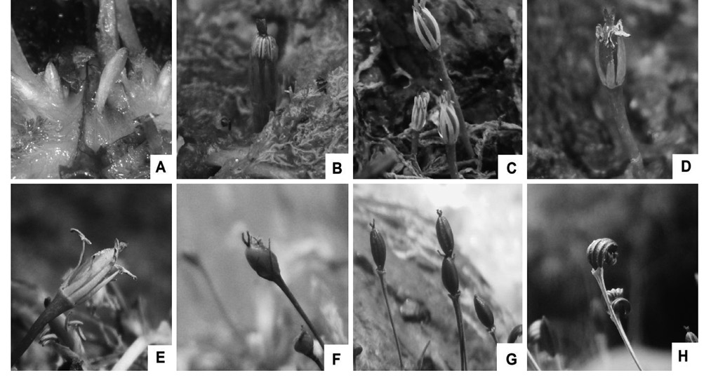 Fig. 1. Fenofases estudiadas. A. Botón floral apenas visible; B. Botón floral con estambres apenas visibles; C. Flores con estambres inmaduros; D. Antesis; E. Estambres con filamentos marchitos; F. Frutos color verde; G. Fruto color café sin abrir; H. Fruto abierto.