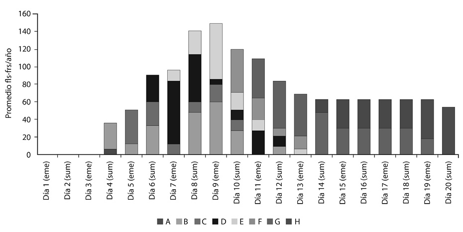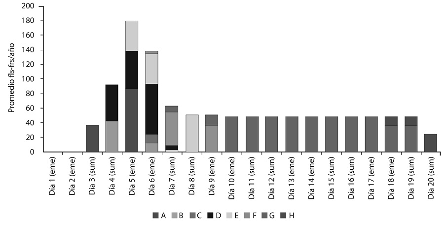 En el Tratamiento 1 el promedio máximo diario de órganos (de diferentes fenofases) se alcanzó al quinto día, con 180 órganos. La antesis (fenofase D) ocurrió a partir del cuarto día, y los frutos abiertos (fenofase H) a partir del día 18. Este tratamiento produjo un promedio anual de 24 frutos por río (Figura 2).
