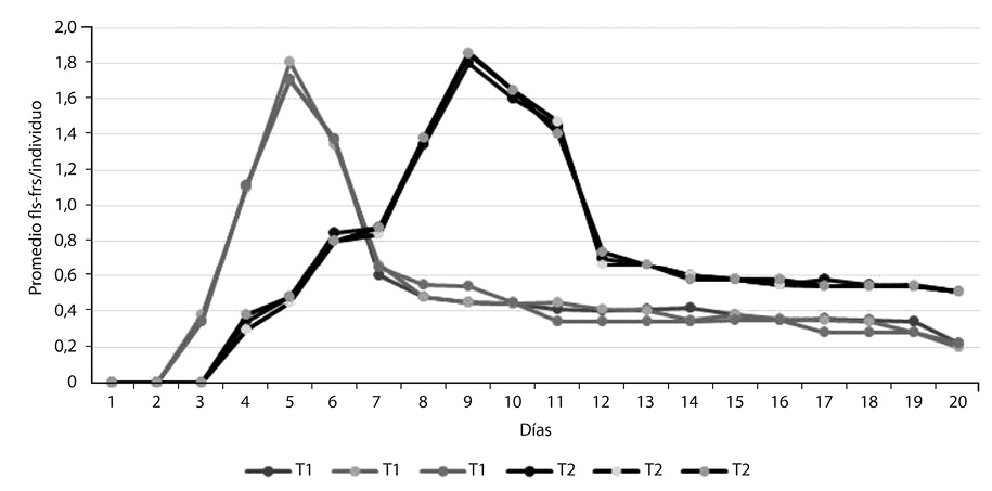 El Tratamiento 2 tuvo un promedio máximo diario de órganos (de diferentes fenofases) al noveno día, con 149. La antesis ocurrió a partir del sexto día, y la fenofase H a partir del día 15. El Tratamiento 2 tuvo un promedio anual de 54 frutos por río (Figura 3).