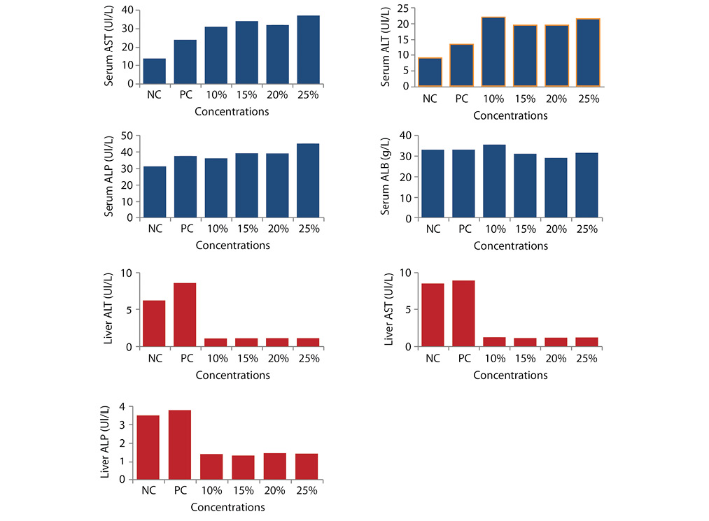 Enzyme Activities in Blood and Liver: Clinical signs of toxicity such as brownish-dark skin colouration, sluggishness, skin abrasion, and rectal collapse, reduction in food and water intake were observed. The significant (p<0,05) increase was recorded in the serum and liver ALT, AST and ALP activities in exposed groups of mice compared with the control and it was dose dependent (Fig. 1). Only 25% group shows a significantly decrease among the exposed groups in liver ALP activities. A decrease was recorded in activities of the ALB in serum of the exposed mice compared to those in the negative control group. In liver ALT, AST and ALP there were a significant (p<0,05) decrease in the activities compared with negative control.