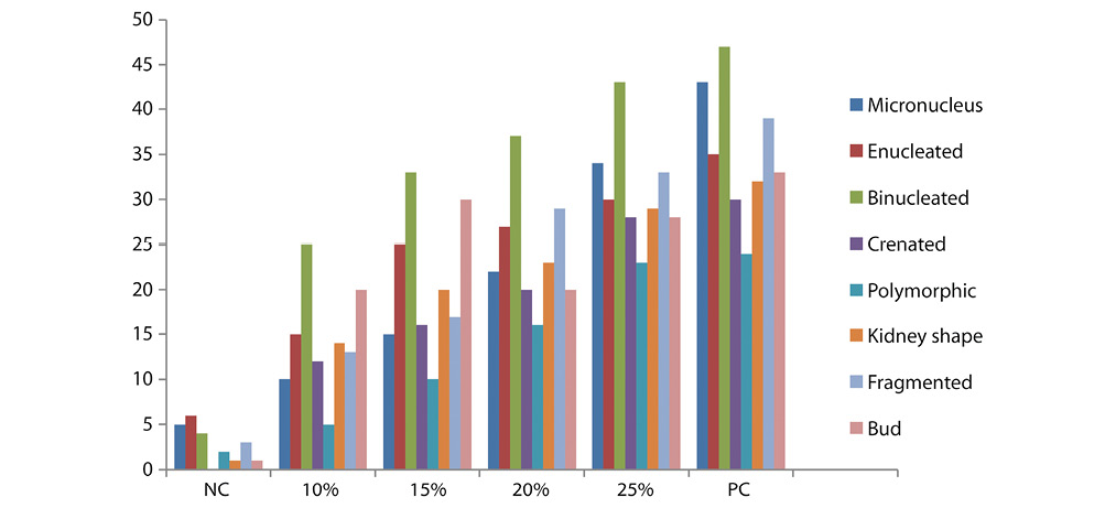 The result of micronucleus analysis shows that there was a concentration dependent difference in the frequency of nuclear abnormalities. Studies indicated that the increase in binucleated cells implies the cytogenotoxic effect of landfill leachates (Fenech et al., 2003). This is also in consistence with similar observations by Talapatra and Banerjee (2007) that the induction of micronucleus and nuclear lesions in the fishes they used was significantly different when compared with control.