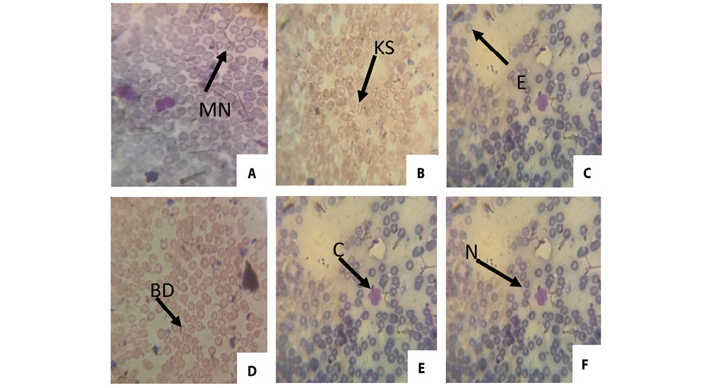 Micronucleus Assay: Blood was collected from the tail. Two slides each from three mice per group were prepared and a thin smeared of blood was made to allowed them air-dry overnight in a dust free environment. The dried slides were then fixed in absolute methanol for 20minutes and allowed to dry overnight. The fixed smears were stained in 10% May-Grunwald and 5% Giemsa stains respectively (Fenech et al., 2003) after which the stained slides were rinsed with distilled water to remove excess stain. The slides were analysed for MN and nuclear abnormalities at 1 000 using Olympus microscope. 500 cells were scored per slide (Carrassco, Tilbury & Myers, 1990). Photomicrographs were taken with Samsung digital camera (F2.5 Bright lens; 16 Mega pixels) and edited with Microsoft office picture manager
