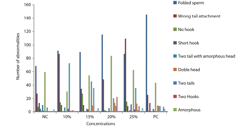 Statistical Analysis: The SPSS software statistical package version (SPSS 16.0) was applied to evaluate the sperm abnormalities, micronucleus & nuclear abnormality, enzymes activities and the differences between the negative, positive and test control groups. The differences were analysed by comparing them with the use One-Way ANOVA and the level of statistical significance were estimated at P< 0,05 using the Duncan Multiple Range (DMRT) test. The results were presented as (mean ±standard error of mean) for each leachate sample.