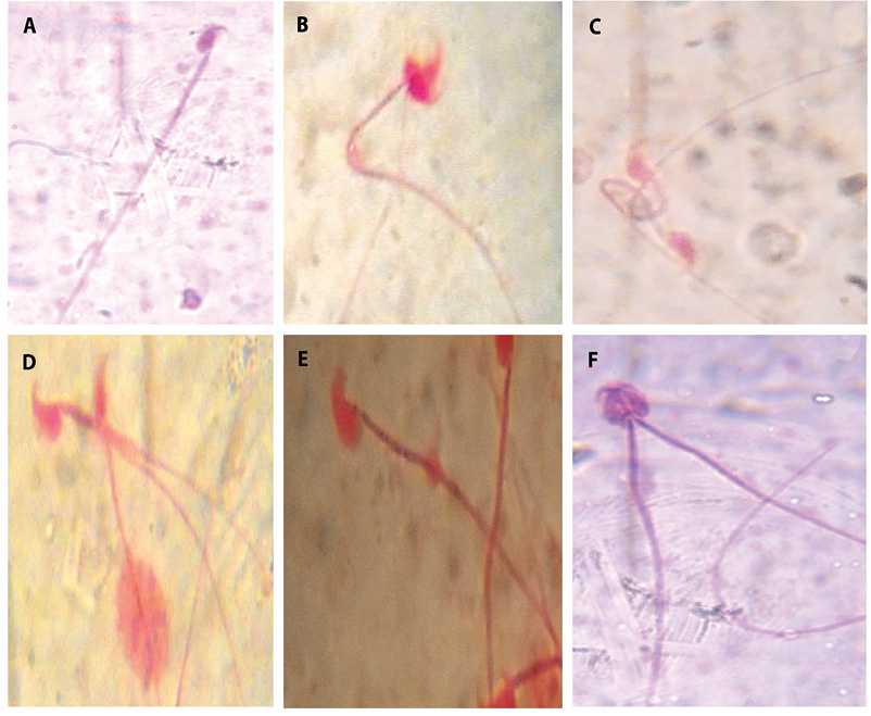 Fig. 5. Abnormal sperm cells in mice exposed to different concentrations of IOASL (A) Normal mouse sperm morphology (B) Sperm with wrong tail attachment (C) Folded sperm (D) Two tails (E) Lack usual hook (F) Fused Head.