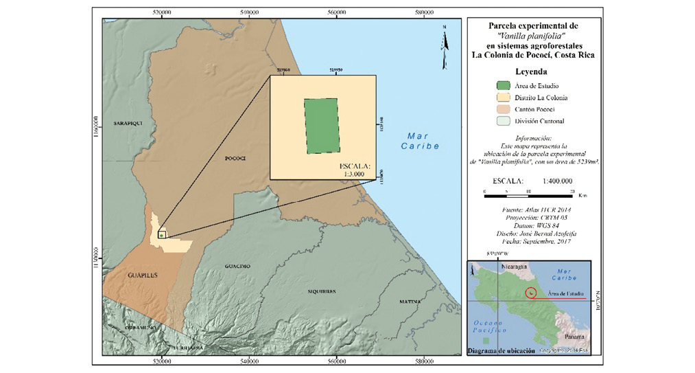 La investigación en campo se realizó en la finca “Río Blanco”, ubicada en La Colonia de Guápiles, Pococí, Limón (10°15’57,1’’N - 83°49’06,4’’W) (Fig. 1). La parcela experimental de 5 239m2 se trabajó bajo un diseño espacial en sistemas agroforestales con árboles de las especies Minquartia guianensis Aubl., Cordia alliodora (Ruiz & Pav.) Oken., Virola koschnyi Warb., Vochysia ferruginea Mart. e Hyeronima alchorneoides Allemão sembrados cada 5x5m y árboles tutores de las especies Erythrina sp (Poró) y Gliricidia sepium (madero negro) sembrados cada 2x2m, los cuales le proporcionaron sombra natural a los explantes de vainilla (Fig. 2). La topografía de la zona es plana con una altura promedio de 157m.s.n.m. El clima es cálido húmedo con promedios anuales de 4 577,2mm de precipitación, 87% de humedad relativa y 24,4°C de temperatura (IMN, 2011). Los suelos de la zona son franco arenosos. La zona de vida según Holdridge es bosque muy húmedo tropical (bmhT) (Quesada, 2007).