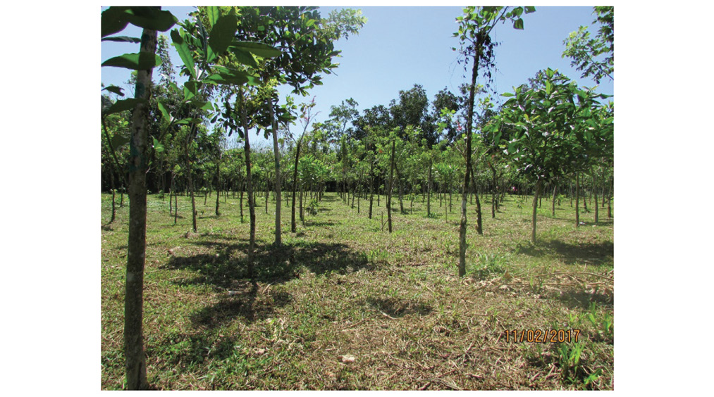 Fig. 2. Parcela experimental establecida en La Colonia de Guápiles con un arreglo espacial en sistemas agroforestales. En la foto, árboles de Vochysia sp. y Erythrina sp.