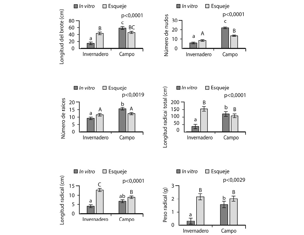 Para el caso de la longitud del brote, las mayores diferencias fueron de 74 y 26% entre la combinación in vitro – campo respecto a las combinaciones que usaron explantes in vitro (p<,0001) y esquejes (p=0,038) en la condición invernadero. Las mayores diferencias en cuanto al número de nudos fueron de 73, 61 y 38% entre la combinación in vitro – campo en comparación con los tratamientos in vitro – invernadero, esqueje – invernadero y esqueje – campo (p<,0001).