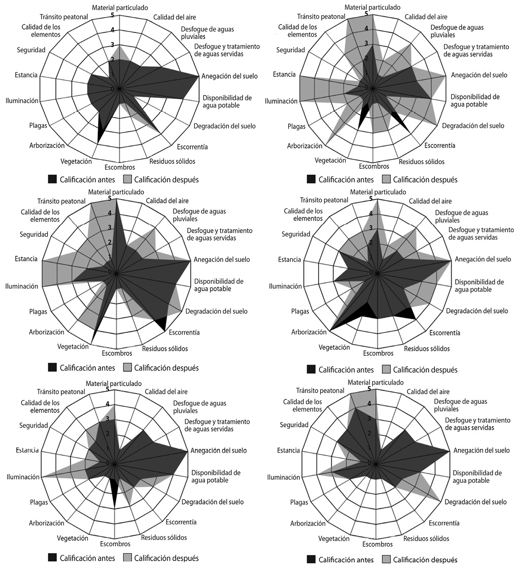 Para el espacio de control se observa que las variables ambientales no modificaron su calificación de acuerdo a la trasposición de áreas (Fig. 1a), a excepción del material particulado y el manejo de residuos sólidos, en donde se presentó una mejora de su condición. Se evidencia, además, una alteración no favorable según la escala nominal asignada en la línea de vegetación.