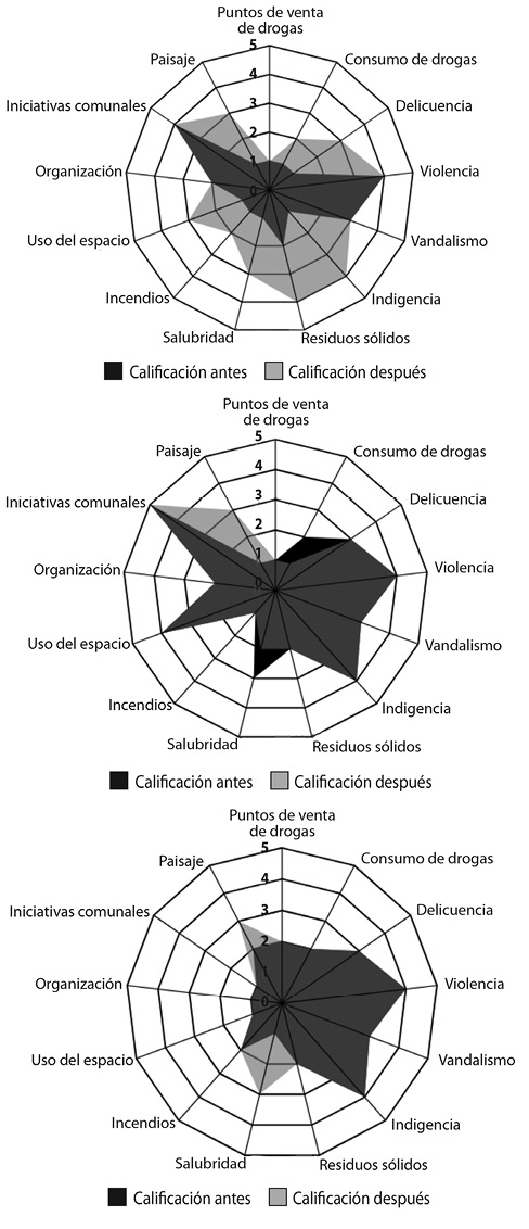 No obstante, la variación porcentual fue poco significativa en los ejes relacionados con los temas de seguridad a nivel general, a excepción del indicador de delincuencia en uno de los espacios públicos. Pese a lo anterior, la apropiación continua del espacio (Vidal & Pol, 2005) en trabajo coordinado puede ser una herramienta fundamental para desvalorizar esta condición de carácter negativo.