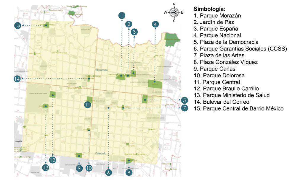 Fig. 1. Distribución de los parques urbanos muestreados del Cantón Central de San José, Costa Rica. Adaptado de Fallas (2016).