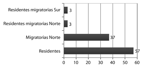 El 57% corresponden a especies residentes (R), el 37% a migratorias norte (MN), mientras que 3% corresponde a especies residente-migratorias norte (R, MN), así como residente-migratorio sur (R, MS) (3%) (Fig. 2). Sobresale Parulidae como la familia con mayor presencia de especies migratorias (9 especies), mientras que Tyrannidae como la familia con mayor cantidad de especies residentes (9 especies).
