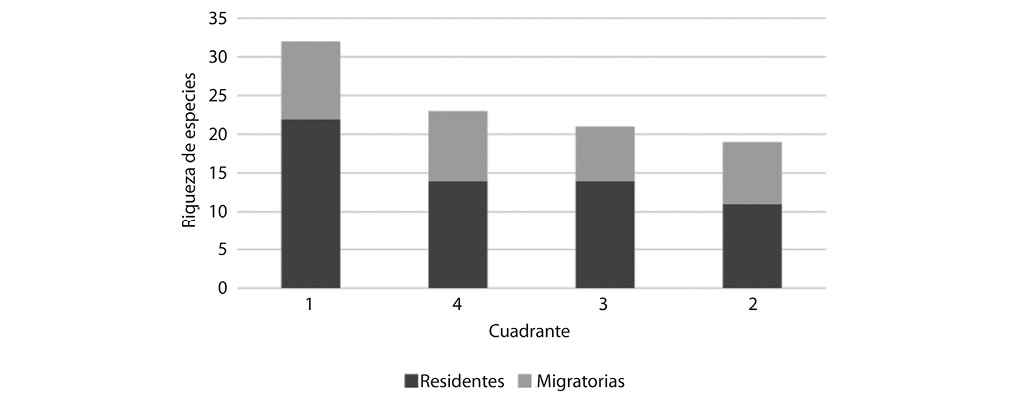 Con respecto al estatus, es importante señalar que en todos los cuadrantes predominaron las especies residentes. En el cuadrante 1 se registraron 22 especies residentes y 10 especies migratorias. En el cuadrante 2 se contabilizaron 11 especies en estatus residente y ocho en estatus de migratoria. Por su lado, el cuadrante 3 se registró 14 especies residente y solamente siete especies migratorias. Tanto en el cuadrante 1, como el 2 y el 3 se encuentra una especie residente con parte de la población migratoria latitudinal norte (Contopus virens). Por su parte, en el cuadrante 4 se registraron 14 especies residentes y 9 especies migratorio (Fig. 3). Es importante mencionar que solo en este cuadrante se registró Pygochelidon cyanoleuca (Cuadro 2 en Apéndice Digital).