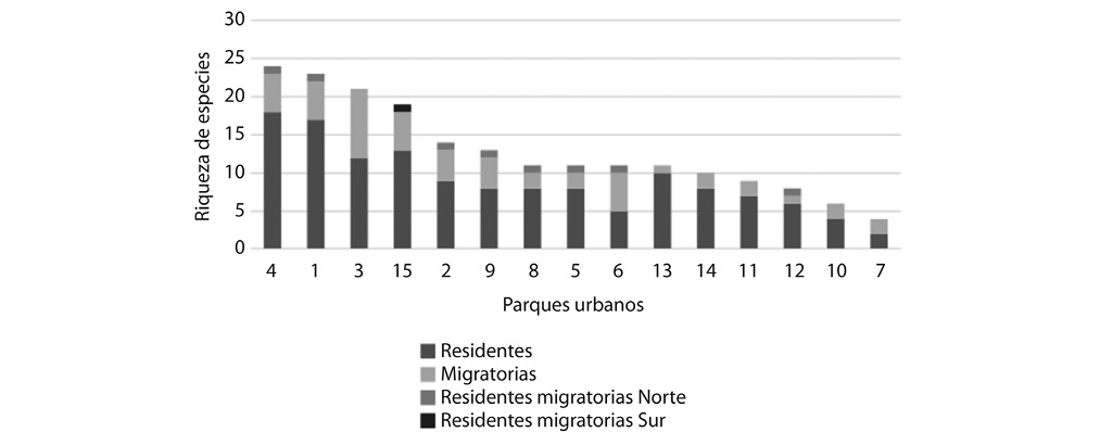 El Parque Nacional fue el sitio en el que se registró mayor riqueza de especies residentes, observándose un promedio de 18,5 migratorias del norte y una residente con parte de la población migratoria norte. Por otro lado, el sitio con menor riqueza corresponde a La Plaza de las Artes, el cual presentó una riqueza de cuatro especies de aves, Columba livia y Quiscalus mexicanus (R) y Vermivora chrysoptera y Setophaga petechia (MN). Es importante mencionar que en 9 parques se identificaron especies con estatus de residente-migratorio norte, mientras que solo en uno de ellos se identifica una especie con estatus residente-migratorio sur (Pygochelidon cyanoleuca) (Fig. 4).