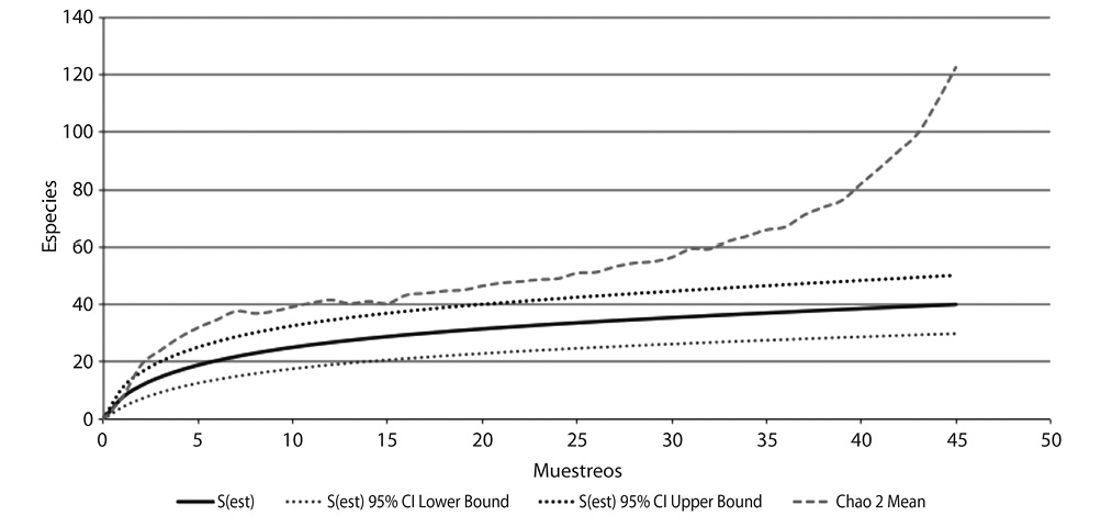 Se elaboró una curva de rarefacción basada en muestreos para determinar qué tan cerca fue posible llegar del número esperado de especies para ese sitio. Esta curva, la cual es una expectativa estadística de la curva de acumulación de especies, calcula el número esperado de especies cuando n número de muestreos son escogidos al azar (Gotelli & Colwell, 2010). La misma se eleva rápidamente a medida que se va acumulando el número de especies debido al incremento en el número de muestreos (i.e. área cubierta), pero disminuye conforme se añaden especies raras hasta llegar a formar una asíntota que indica que todas las especies para el área de muestreo han sido registradas (Ugland et al., 2003). Para elaborar este análisis se utilizaron todas las especies detectadas durante y fuera de los conteos. Los intervalos de confianza de la curva fueron calculados al 95%. Además, se realizó una estimación de la riqueza de especies utilizando el estimador no-paramétrico Chao2 (Chao2, 1987) incluyendo las especies vistas. El estimador Chao2, que ha demostrado ser uno de los más útiles en varias comunidades bióticas (Walther & Morand, 1998), incluyendo aves (Chazdon et al., 1998; Herzog et al., 2002), estima la riqueza total incluyendo aquellas especies no presentes en los muestreos; asimismo, es menos sensible a la heterogeneidad en la distribución de las especies y a la variabilidad en la probabilidad de encontrarlas (Hortal et al., 2006). Tanto la curva de rarefacción como el estimador de la riqueza Chao2 fueron calculados utilizando el programa EstimateS v.9 (Colwell, 2013). Se realizaron 100 corridas aleatorizadas y se extrapoló a un total de 80 muestreos.