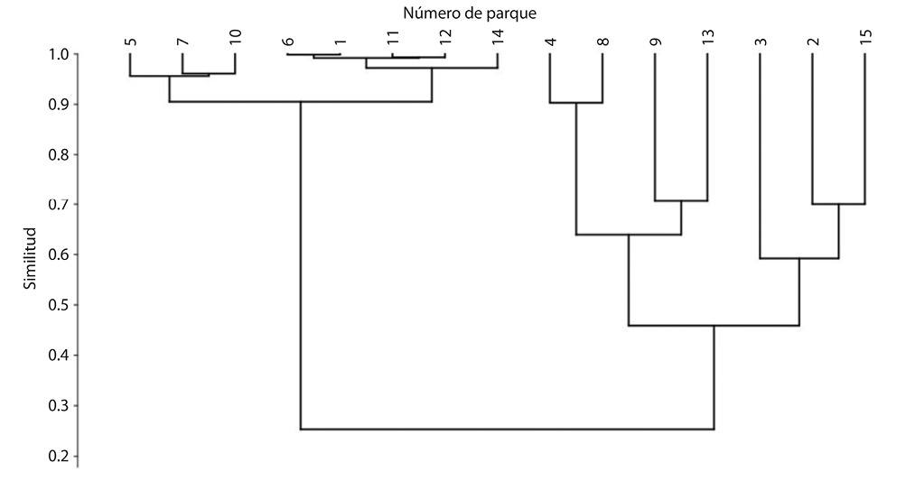 Mediante el índice de similitud de Morisita se comparó la composición de especies de aves por parque y se determinó que existen 2 grandes grupos con 2 subgrupos cada uno. Un primer grupo integrado por los parques 5-7-10-6-1-11-12-14 con una similitud aproximada al 90% y del cual se subdivide en 2 subgrupos. Así mismo el segundo grupo lo integran los parques 2-3-4-8-9-13-15 con una similitud del 45% entre la riqueza y abundancia de especies.