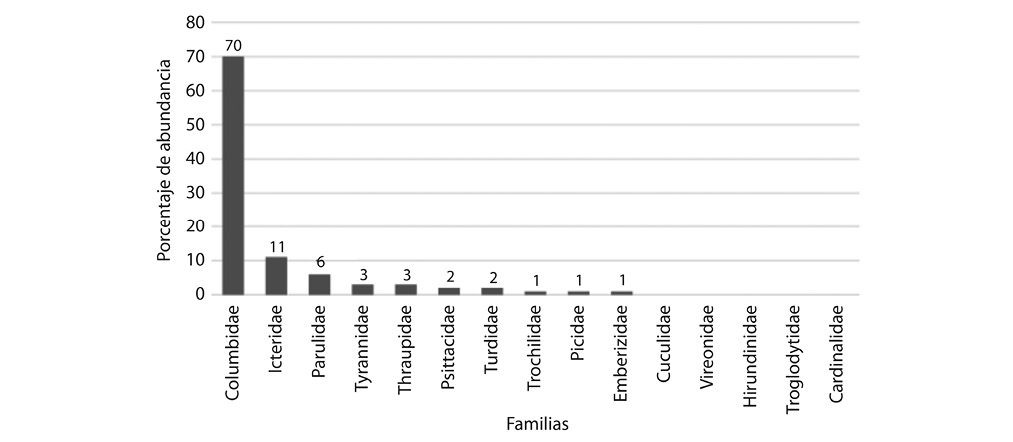 Fig. 2. Valores porcentuales de avifauna observada en 15 parques urbanos el Cantón Central de San José en el Periodo setiembre-diciembre 2009.