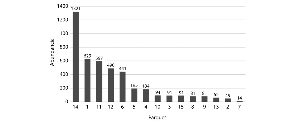 Abundancia de especies de aves: La abundancia promedio de individuos por parques fue de 173,06, (DE= 177,6) con un ámbito de oscilación entre 9 y 647, indicando que la mayoría de los promedios de individuos por parque son similares al promedio, sin embargo, el rango de oscilación de datos esta entre 9 y 647 individuos, siendo los picos la Plaza de las Artes y el Bulevar del Correo respectivamente, evidenciando la disparidad en cuanto a la abundancia de aves.