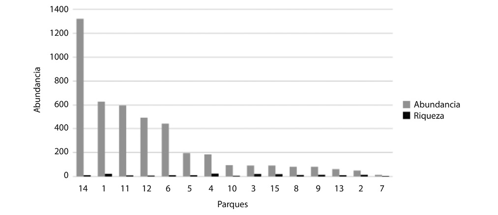 Riqueza de especies de aves: Se determinó una riqueza total de 40 especies de aves (oscilando entre cuatro y 24 especies según el parque), distribuidas en seis ordenes, 15 familias. El orden con mayor representatividad de familias y especies fue Passeriformes con 10 familias de las cuales Tyrannidae (S=10) y Parulidae (S=9) fueron las familias con mayor cantidad de representantes. Las especies que registraron mayor cantidad de individuos para este orden fueron Quiscalus mexicanus (S=274) y Thraupis episcopis (S=72). El orden Columbiformes fue el siguiente en cuanto a cantidad de representantes, registrándose cuatro especies de palomas, y Columba livia fue la especie más abundante en toda el área de estudio, con 1726 individuos registrados (Cuadro 2 en Apéndice Digital).