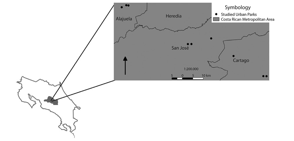 These parks have similar conditions: size between 500 to 1 000 m2; flat topography; squared shape; most trees were introduced species, mainly Ficus benjamina and Pinus sp.; there were between 5 and 30 trees per park; all are surrounded by streets, commercial areas, populated neighborhoods and a catholic church; all have at least some infrastructure (sidewalks, benches, sport areas and a kiosk); average altitude of 1 100 msnm; two seasons, dry (December to April) and rainy (May to November); average annual rainfall around 2 400 mm; and average annual temperature of 20°C (IMN, 2013).