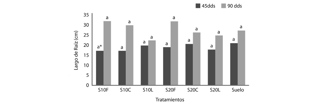 El desarrollo del sistema radical no mostró problemas en el crecimiento bajo la influencia de los residuos industriales (Fig. 1). El largo de raíz a los 45 dds no mostró diferencia estadística significativa (α=0,05) en comparación al resto de los tratamientos, este efecto fue similar para la evaluación a los 90 dds. Sin embargo, al analizar las tendencias de crecimiento de las raíces, se encontró que las plantas bajo la influencia de un 10% de fibra y ceniza (S10F y S10C) mostraron mayores tendencias de crecimiento que los demás tratamientos, siendo mayor para la aplicación de 20% de fibra (S20F).
