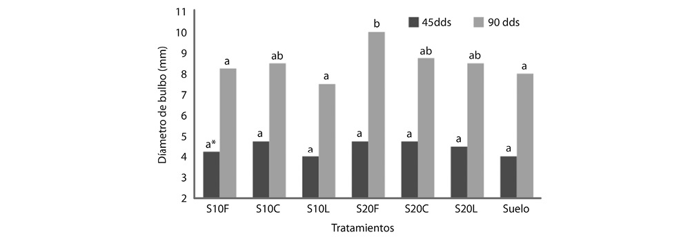 El crecimiento del diámetro del bulbo en las plántulas de palma aceitera, se encontró un incremento significativo al agregar compost de fibra en mezcla al suelo en las bolsas (Fig. 2). El diámetro de bulbo en los primeros 45 dds no mostró diferencias significativas en comparación al resto de los tratamientos, sin embargo, al analizar este parámetro de crecimiento a los 90 dds se encontró que el tratamiento S20F mostró el mayor diámetro de bulbo (10mm) en comparación a las plantas sembradas en Suelo (8mm) significativamente (α=0,05).