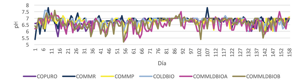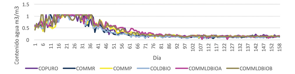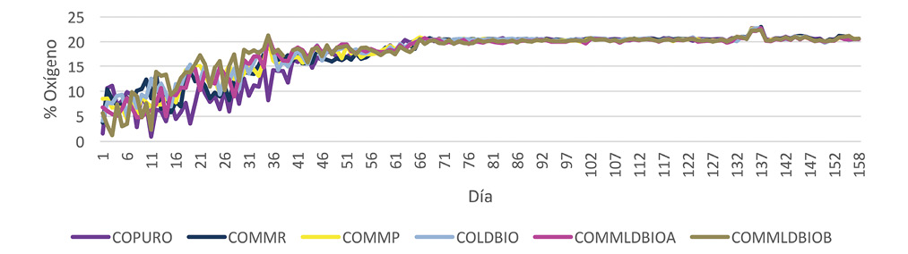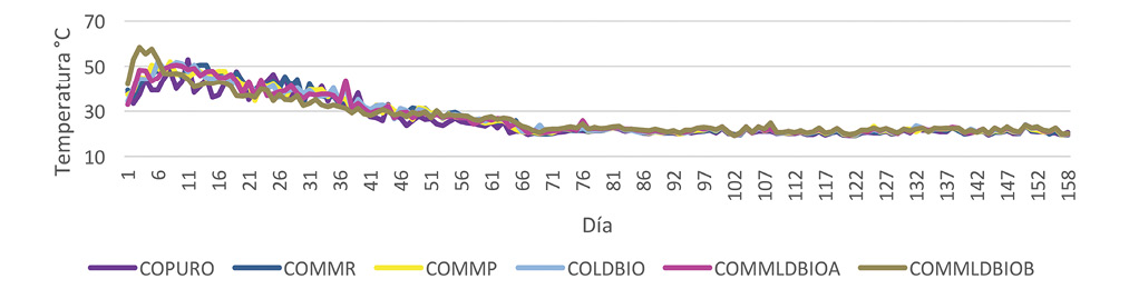 Proceso de elaboración del compost: Todas las pilas de compost experimentaron las tres etapas teóricas del compostaje durante el proceso de producción: mesófila, termófila y mesófila 2 (Fig. 1). El tiempo aproximado de estabilización fue de 70 días en todas las pilas. A partir de ese periodo, los seis tipos de compost producidos entraron en un lapso de maduración donde las variables monitoreadas mostraron un comportamiento estable (Fig. 2-5). Este periodo tuvo una duración aproximada de 75 días.