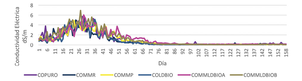 CE: La conductividad eléctrica es un parámetro importante en la calidad del compost como indicador de la concentración de sales en el sustrato (Maheshwari, 2014), ya que el exceso de sales minerales como el Na puede causar inhibición en el crecimiento de las plantas (Bernal et al., 2017), lo cual puede ocasionar problemas de germinación y de desarrollo radicular (Stoffella & Kahn, 2001). Todos los compost mantuvieron la CE dentro del rango optimo reportado por US Composting Council (2002) en 10 mS/cm, lo cual indica que la presencia de sales en los compost se encuentra dentro de los límites aceptables. Este parámetro no fue afectado con la incorporación de MM y LDBIO en el material compostable.