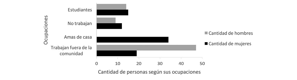 La población de las viviendas entrevistadas se conformó por 88 mujeres (54 %), de las cuales 34 son amas de casa, 19 trabajan fuera, 12 no trabajan y 15 son estudiantes. En cuanto al género masculino, se contabilizaron 74 hombres (46 %), 47 trabajan fuera de la comunidad, nueve no cuentan con trabajo y 14 son estudiantes (Fig. 3). Por lo tanto, se evidencia una cantidad importante de mujeres que podrían involucrarse en actividades comunales y proyectos ambientales, así como un porcentaje más bajo de hombres.