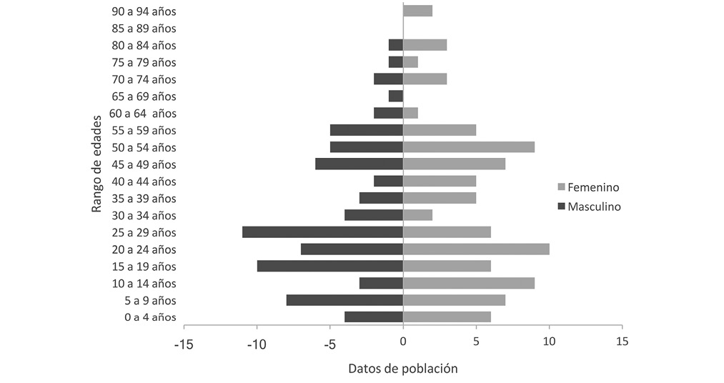 Estructura poblacional según género, edad y nivel de escolaridad: se contabiliza un total de 162 habitantes, de los cuales el 54 % son mujeres y el 46 % son hombres. Las diferencias más importantes según sexo se presentan en el grupo de 10 a 14 años (5,56 % más mujeres), 25 a 29 años (6,79 % más hombres) y de 40 a 44 años (3,9 % más mujeres). La mayor parte de los pobladores son jóvenes, con 25 años o menos (48,15 %), seguido de personas adultas entre 25 y 64 años (43,21 %), mientras que los adultos mayores representan el 8,64 % (más de 65 años) (Fig. 4).