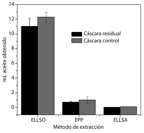 El porcentaje de rendimiento del método de destilación con equipo Soxhlet utilizando como solvente hexano coincide con lo reportado por Cardona, Ríos y Restrepo (2006), y las deficiencias en el método de extracción por prensado se deben a que, al comprimir la cáscara, una cantidad del aceite queda adherido a la plantilla plástica utilizada al igual que en el frasco contenedor, previo a la centrifugación. El bajo rendimiento en la extracción líquido-líquido con solvente acuoso se le atribuye al proceso de fermentación que se lleva a cabo en la maceración y a las pérdidas causadas por el restante adherido a las paredes del embudo de separación. Se encontró que la cáscara control presenta mayor rendimiento que la cáscara residuo, sin embargo, no se obtuvo variación en la obtención del aceite de la cáscara residual.