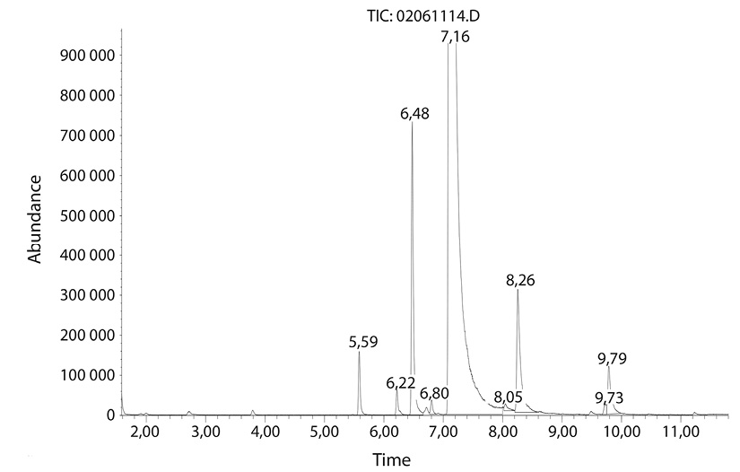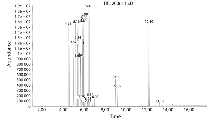 Posteriormente se determinaron los componentes del aceite por cromatografía de gases, con el objetivo de conocer los compuestos que le confieren sus propiedades inhibitorias de microorganismos. Se utilizó un cromatógrafo de gases series GC Agilent Technologies HP 7890 acoplado a un detector selectivo de masas 5973 Network Agilent, con columna capilar 30m x 25µm x 0,25mm marca HP, con inyector split/splitless. El modo de inyección de la muestra para determinar compuestos orgánicos volátiles y semivolátiles fue por espacio de cabeza (Head-space) y la identificación de componentes no volátiles se realizó por inyección directa. Estabilizado el equipo, se cargó el programa de aceite con las condiciones de Inyector: temperatura: 200°C; presión: 17psi; flujo: 42,3 mL/min; relación 40:1. Columna: DB-5MS, 0,25mm×30m×0,25µm; temperatura máxima: 350°C; presión a vacío: 17psi. Horno: temperatura inicial: 50°C por minuto; temperatura final: 250°C por 25 minutos. Detector: temperatura: 250 °C.