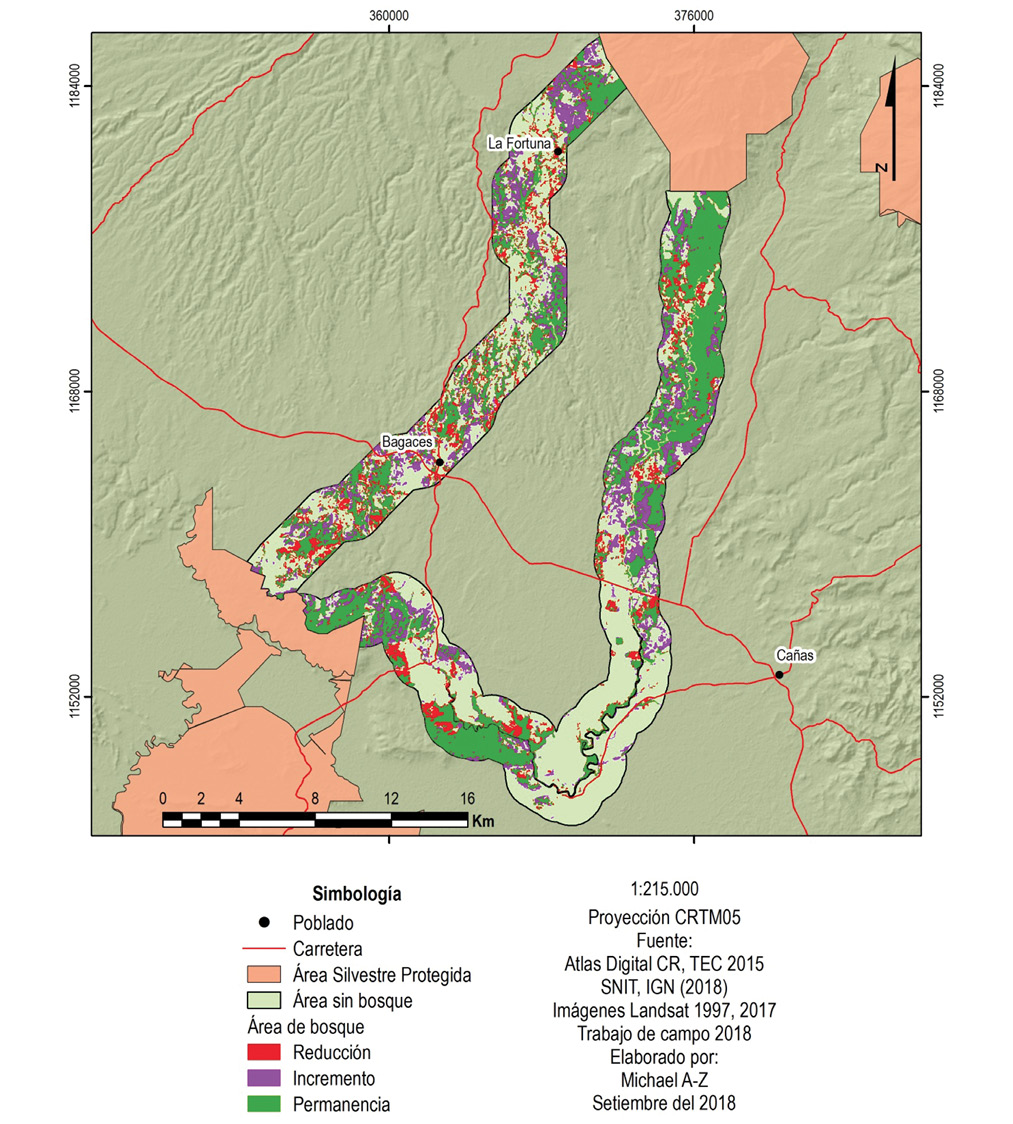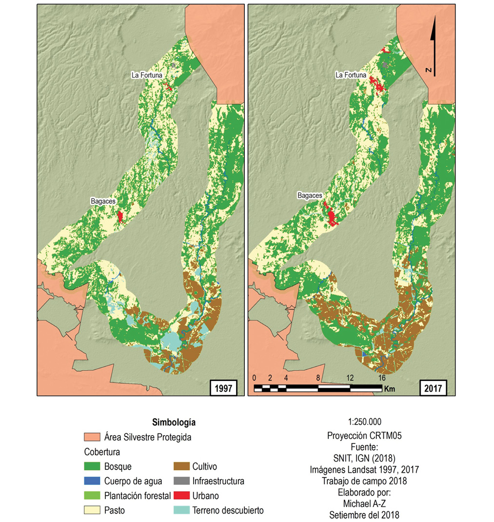 ABSTRACT: “Natural cover permanence in two connectivity proposals between protected wildlife areas of Costa Rica”. Introduction: Riparian zones are an alternative for connectivity in landscapes where natural cover has been fragmented. Objective: To analyze structural connectivity between two protected wildlife areas of Costa Rica, through riparian zones, and an officially established route. Methods: The two protected wildlife areas were Lomas Barbudal Biological Reserve and Miravalles Protective Zone, Guanacaste province. Using supervised classification of Landsat images from years 1997 and 2017, land cover was obtained for riparian zones and the official route. Based on this information, forest permanence was analyzed and several fragmentation indicators calculated for the two connectivity proposals. Results: Forest was more extensive and permanent in the riparian zones; nevertheless, both connectivity proposals had interruptions in connectivity and isolated forest sectors. In the official route, interruption was caused mainly by urban areas; riparian zones were interrupted by agriculture. Conclusion: Riparian zones would also provide good structural connectivity, but they need to recover such connectivity too.