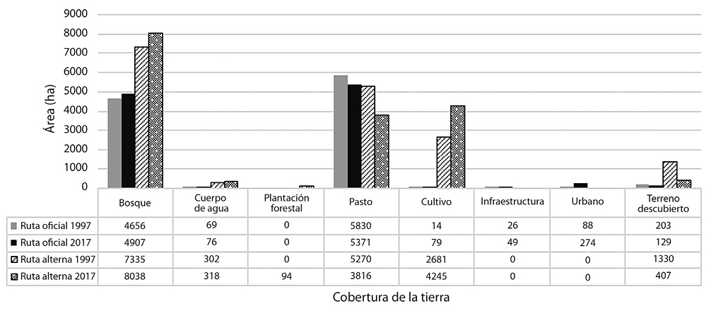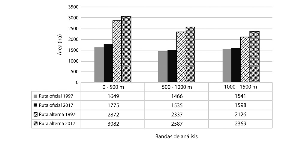 Tanto en 1997 como en el 2017 hubo una disminución del área de bosque desde la banda más cercana hacia la más distante de cada propuesta de conectividad. La excepción ocurrió de la segunda a la tercera banda en la ruta oficial. Sin embargo, en esa ruta sí se presentó una disminución del área boscosa de la primera a la segunda banda en ambos años. La reducción en la extensión del bosque de la primera a la segunda banda fue más marcada en la ruta alterna para los dos años (Fig. 3).