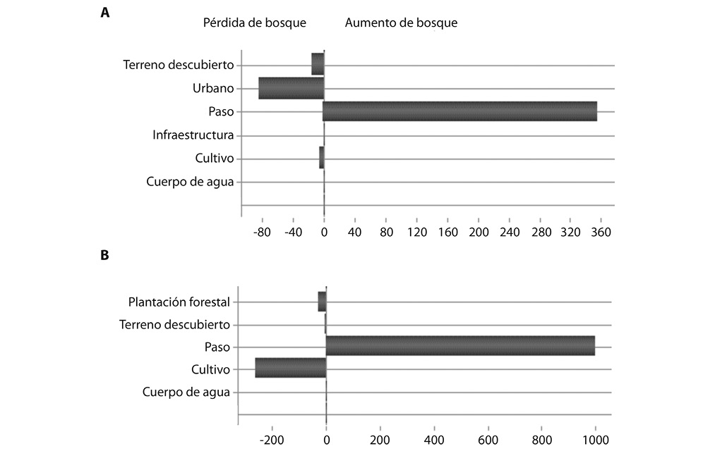 Fig. 4. Pérdidas y aumentos (en ha) de área boscosa explicados por distintas coberturas de la tierra en las dos propuestas de conectividad. a) ruta oficial, b) ruta alterna.